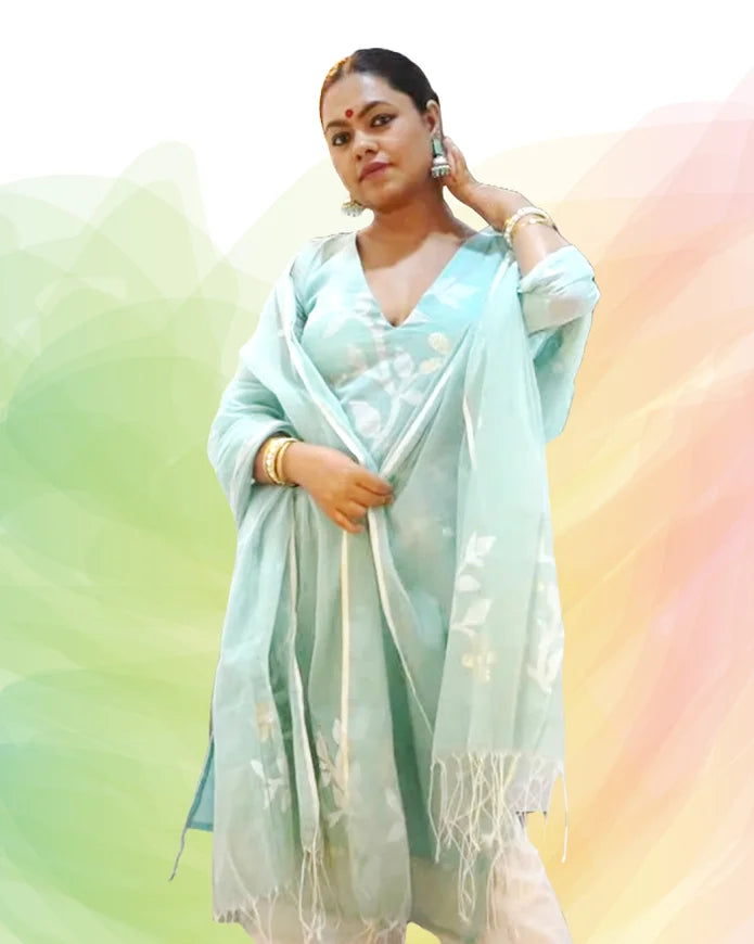 Aqua Mist | Handloom Jamdani Muslin Unstitched 2-Piece Kurti | Paithani Design