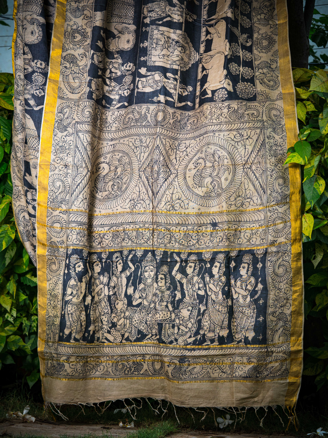 Our collection is a canvas of dreams adorned with delicate lotuses, flowers, paisleys, cows, rural life, majestic peacocks, and also divine characters from Ramayana and Mahabharata hand-painted by the skilled hands of Sri Kalahasti's finest artisans.