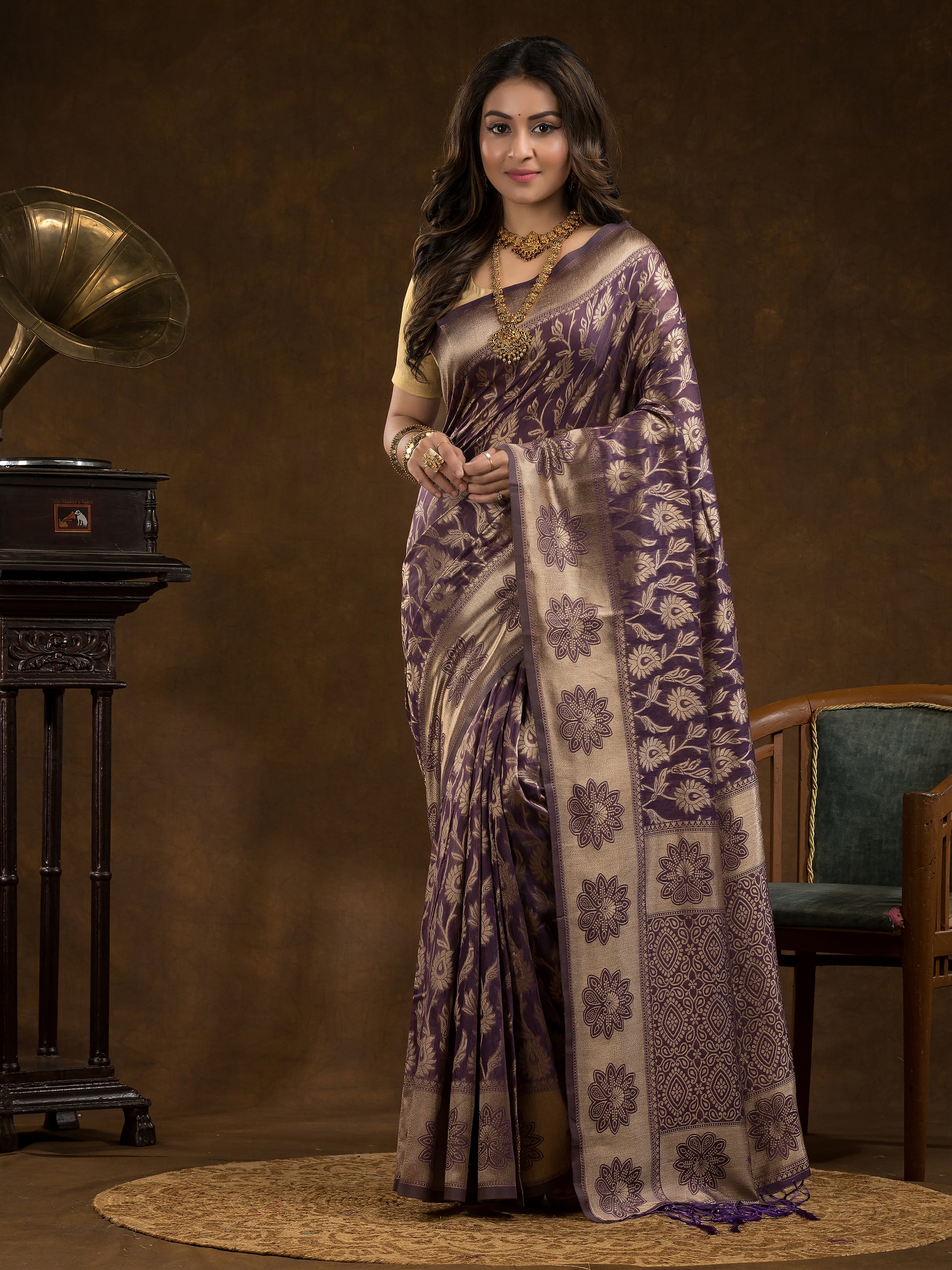 Floral woven design Silk blend Jacquard Saree | Deep Purple