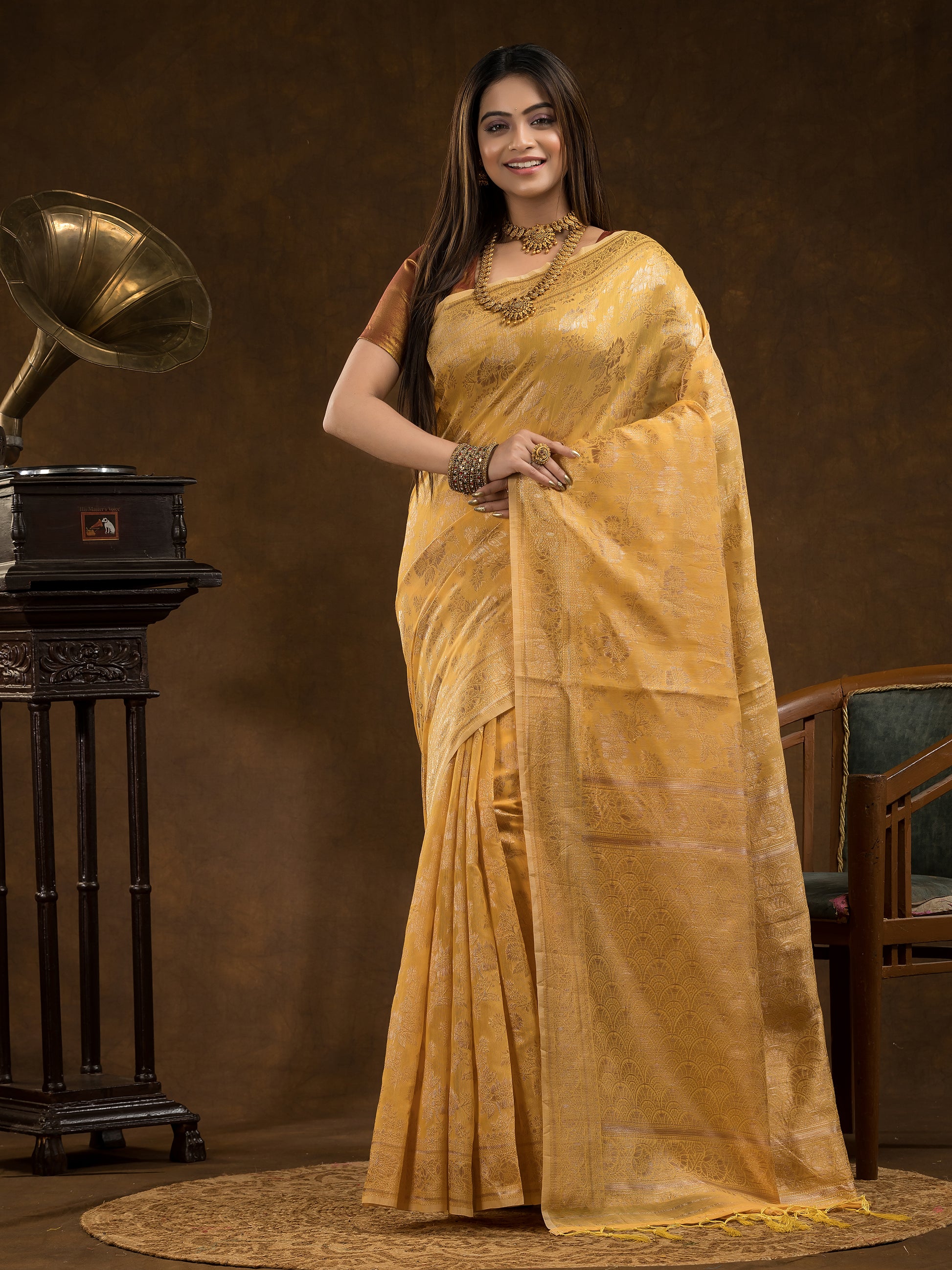 Floral woven design Silk blend Jacquard Saree | Golden Yellow