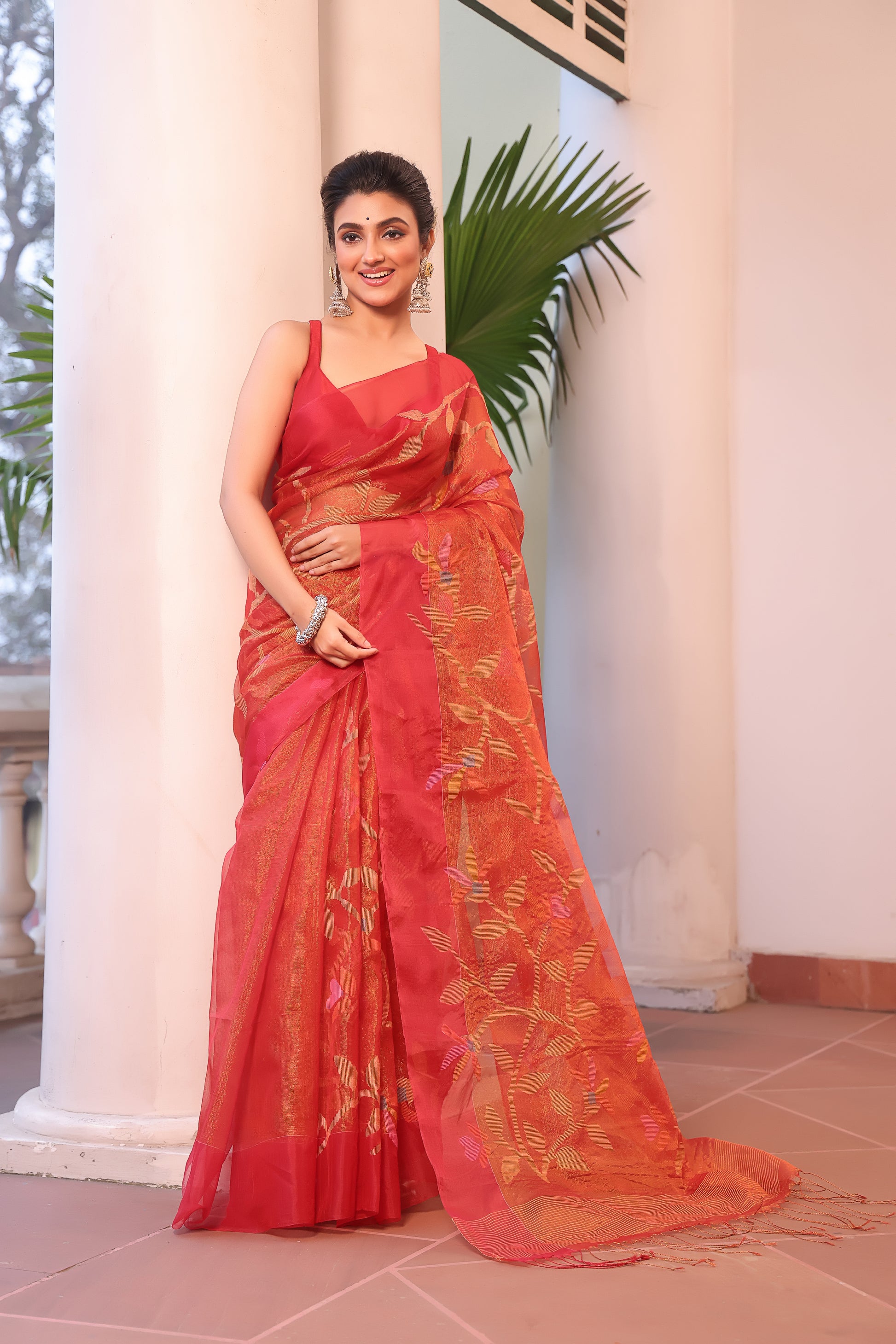 Classic Red Pure Hand Made Jamdani Saree - 093