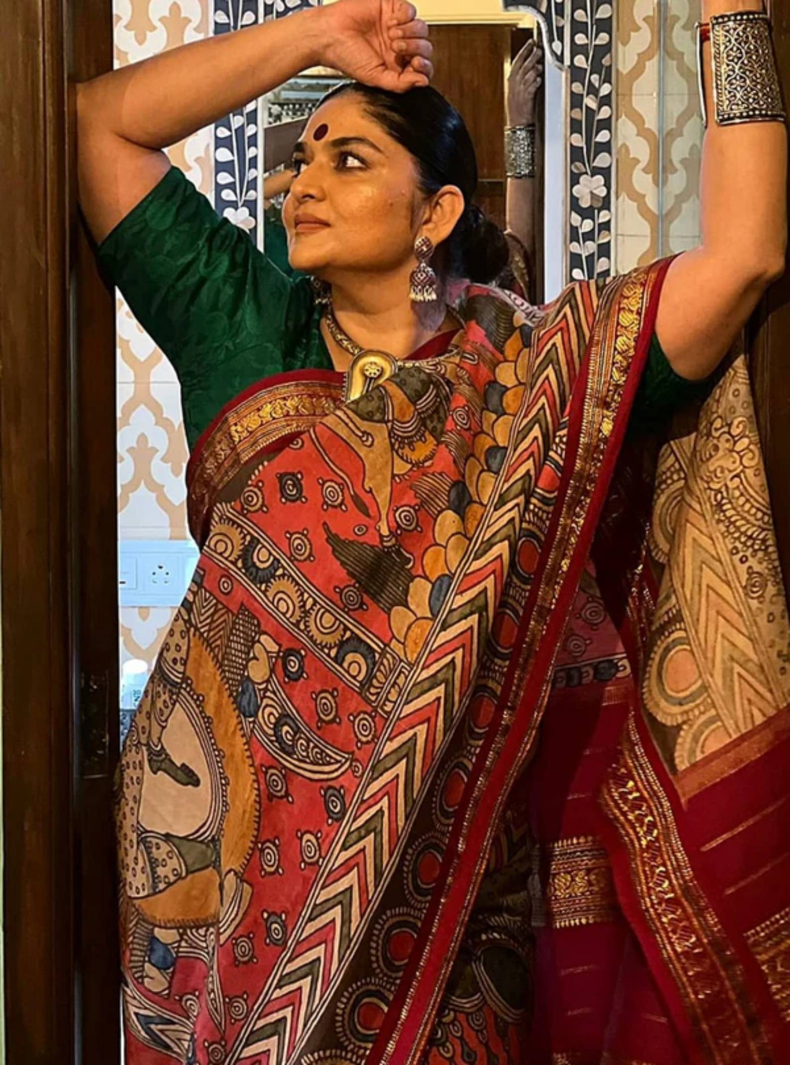 At the heart of our brand is the revered art form of Srikalahasti Penwork Kalamkari, a living testament to the creative genius of artisans who have honed their skills over generations. With meticulous precision and boundless imagination, these master craftsmen infuse each creation with the soulful hues of natural vegetable dyes, creating wearable works of art that transcend time.