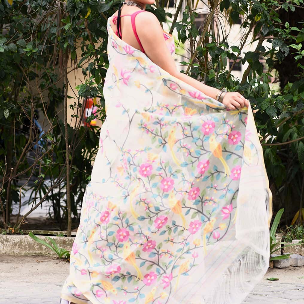 Behold the exquisite Muslin Jamdani Saree, a true masterpiece akin to a work of art. Delicately adorned with vibrant floral weavings spanning its entirety, this saree boasts intricate patterns of village motifs and renowned jamdani designs, such as butidar, Kalka, and fulwar. Crafted over an arduous period of 3-4 months by acclaimed weavers from the rural landscapes of India, each saree is a testament to their unparalleled skill and dedication.