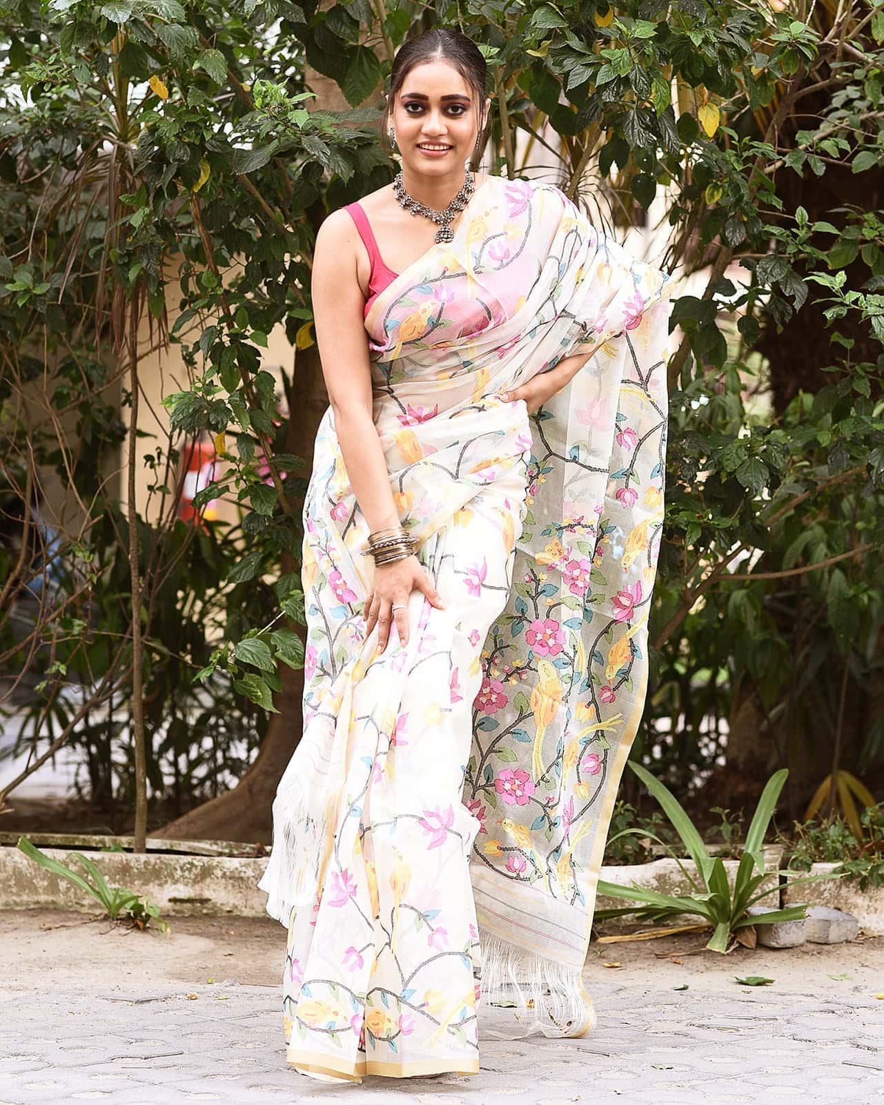 Embark on a journey through indigenous weaves with our Muslin Jamdani Saree, adorned with enchanting village motifs and nature-inspired designs.