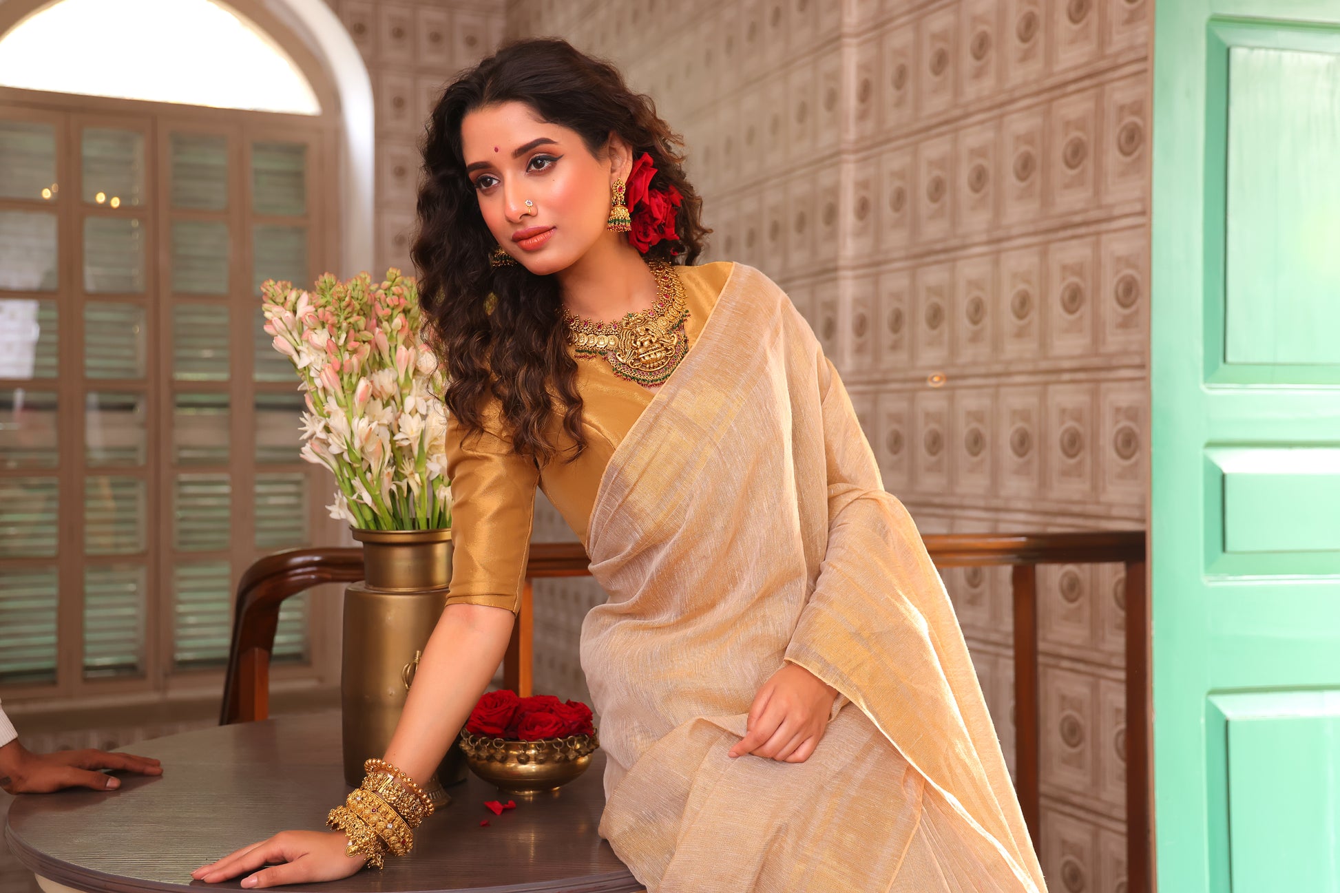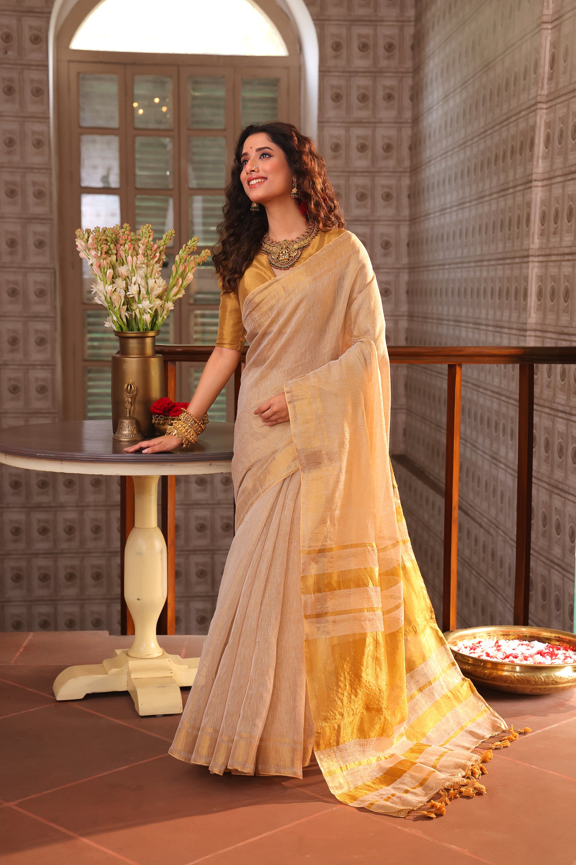 Golden Tissue Silk Saree in Linen White and Golden Pallu - 022