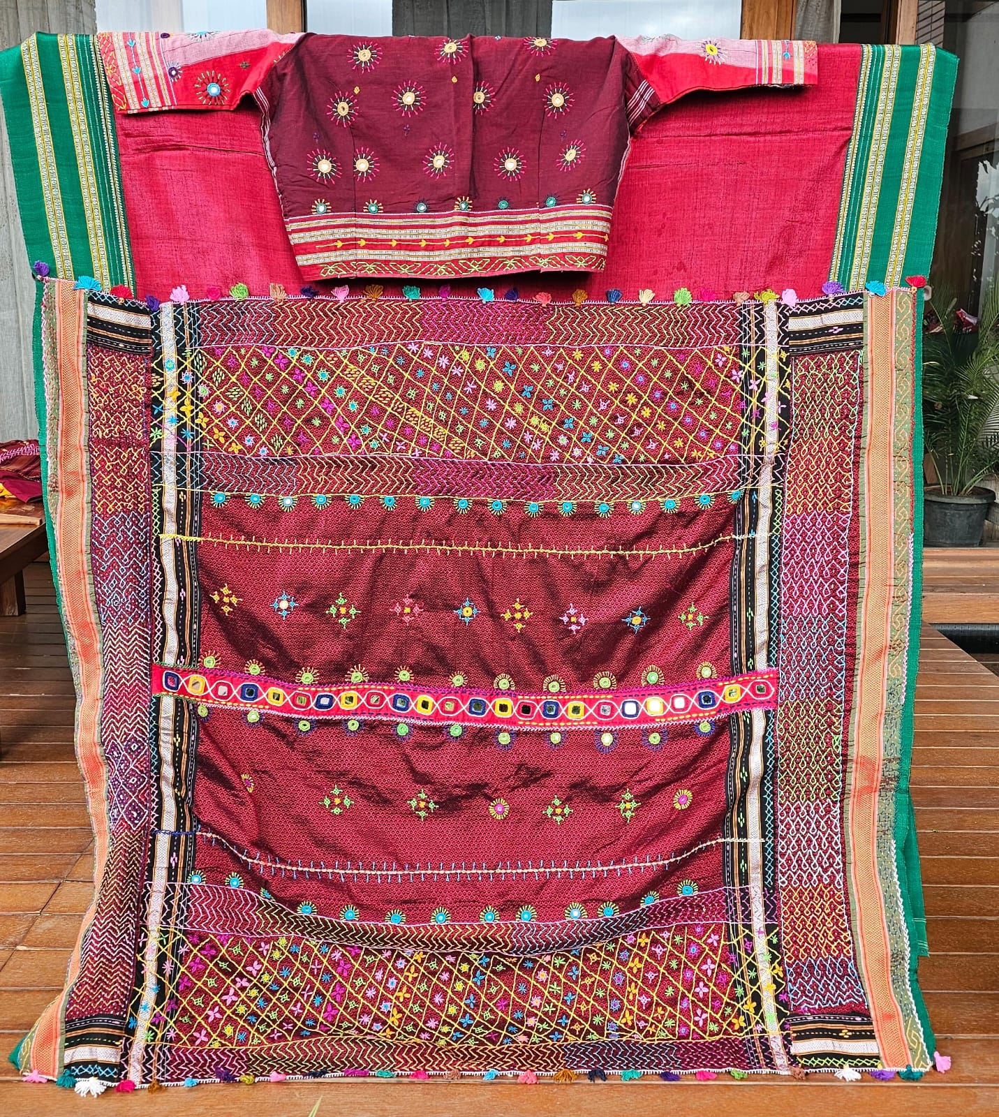 • Pure Ilkal handloom fabric • Traditional Lambani hand embroidery • Intricate mirror work with vibrant thread detailing • Rich contrast border and elegant pallu • Lightweight, breathable & comfortable