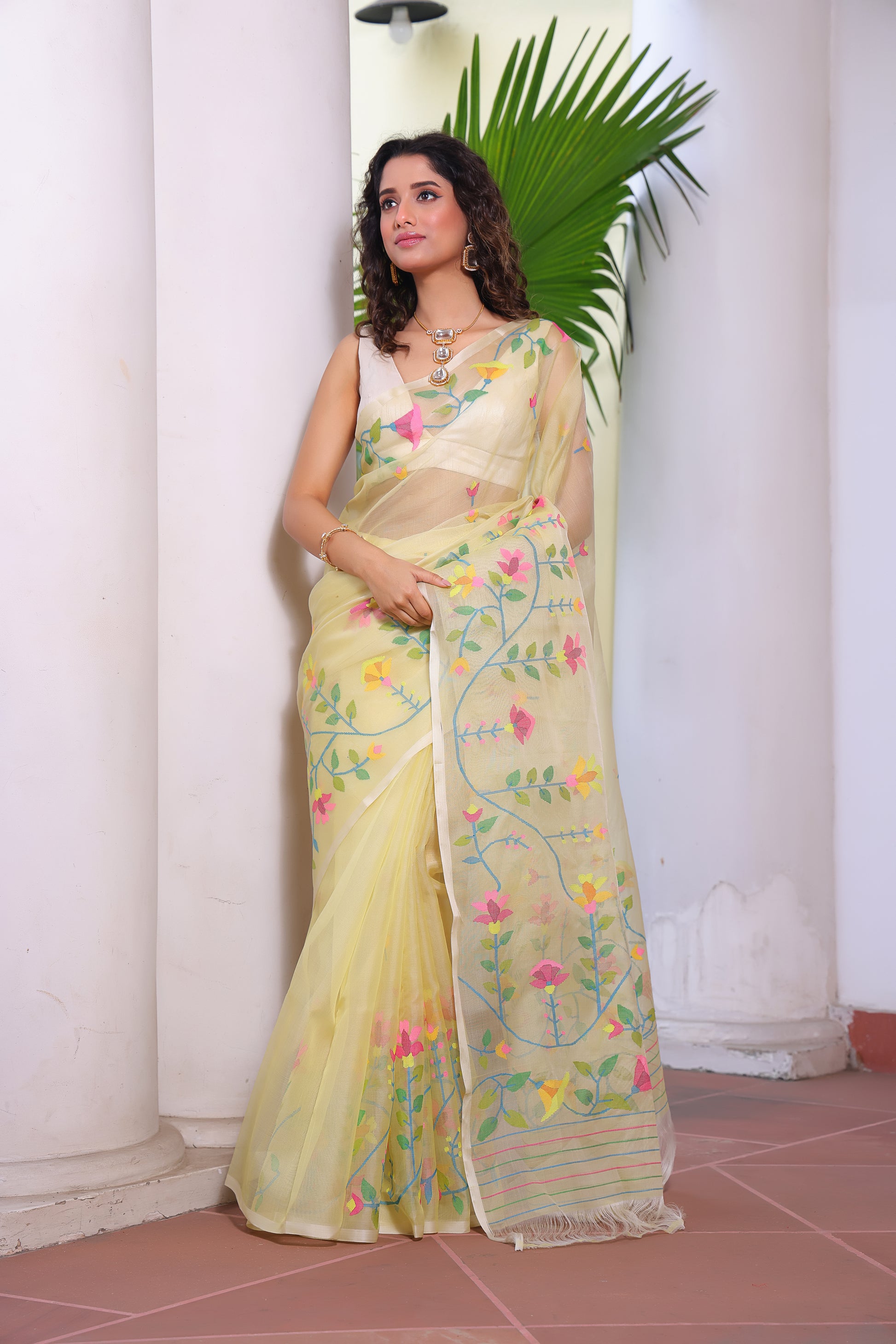Behold the exquisite Muslin Jamdani Saree, a true masterpiece akin to a work of art. Delicately adorned with vibrant floral weavings spanning its entirety, this saree boasts intricate patterns of village motifs and renowned jamdani designs, such as butidar, Kalka, and fulwar. Crafted over an arduous period of 3-4 months by acclaimed weavers from the rural landscapes of India, each saree is a testament to their unparalleled skill and dedication.