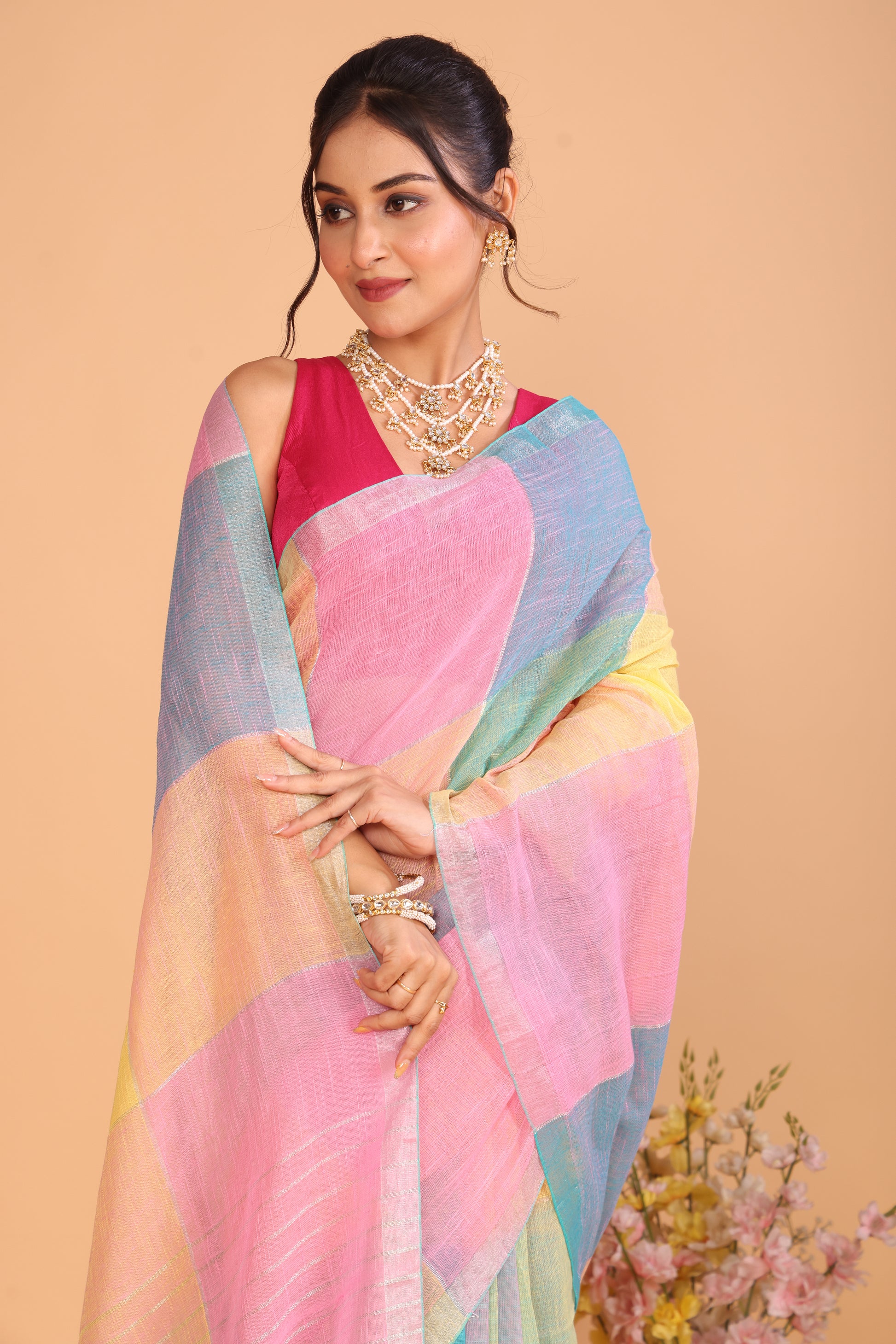 Linen Checks Saree With Blue Pink Yellow - 109