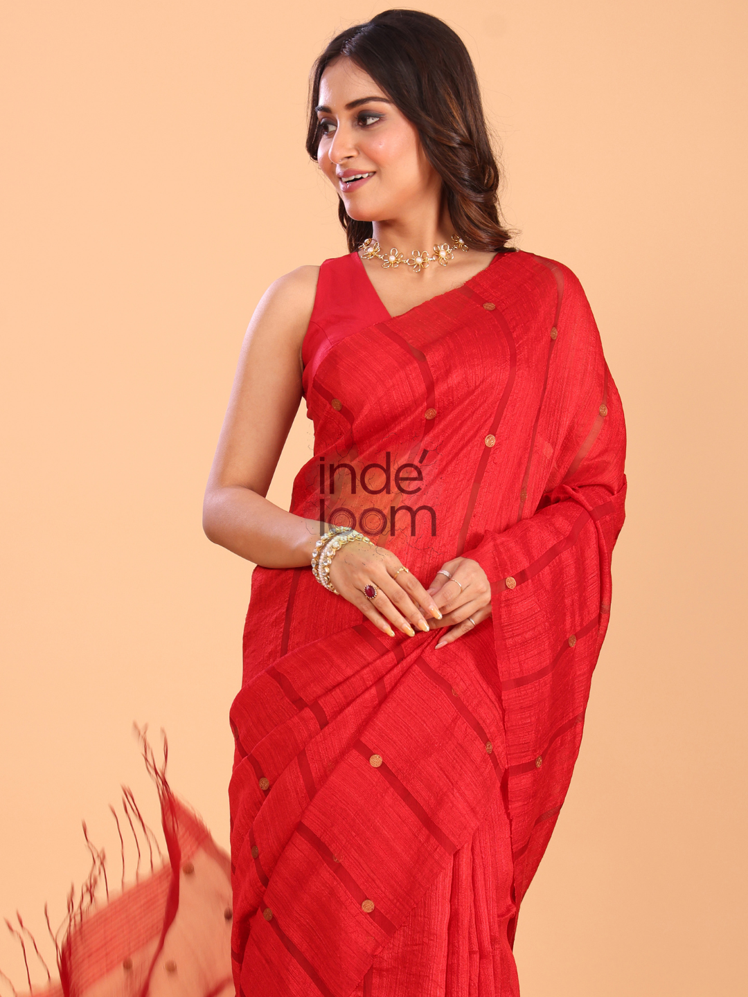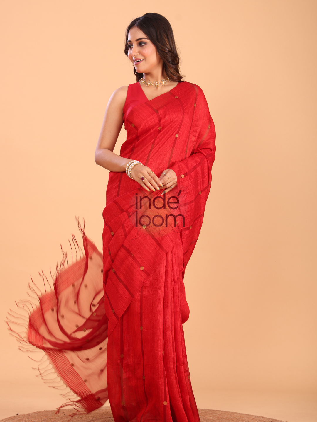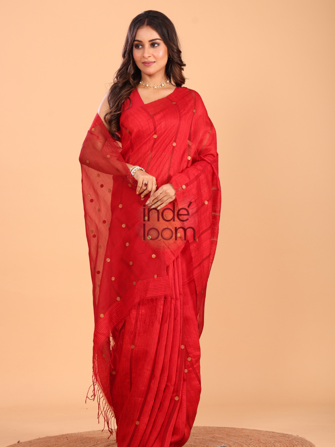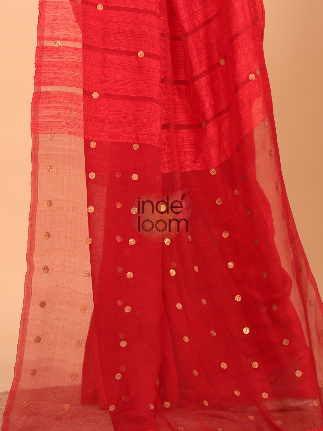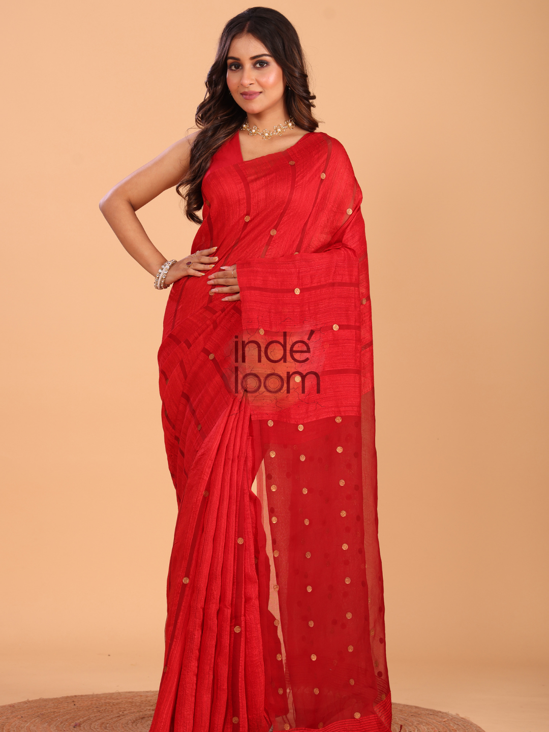 Technique: Employing the Needle Jamdani technique, this saree features extra-weft ornamentation, meticulously handwoven woven on-loom by skilled artisans. Patterns are meticulously transferred from graph paper to warp, where each motif is intricately crafted using needles or extra weft shuttles.
