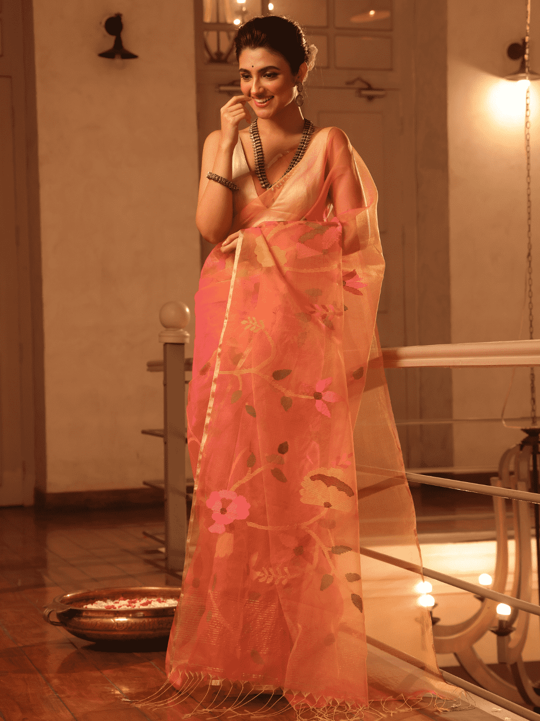 Technique: Employing the Needle Jamdani technique, this saree features extra-weft ornamentation, meticulously handwoven woven on-loom by skilled artisans. Patterns are meticulously transferred from graph paper to warp, where each motif is intricately crafted using needles or extra weft shuttles.