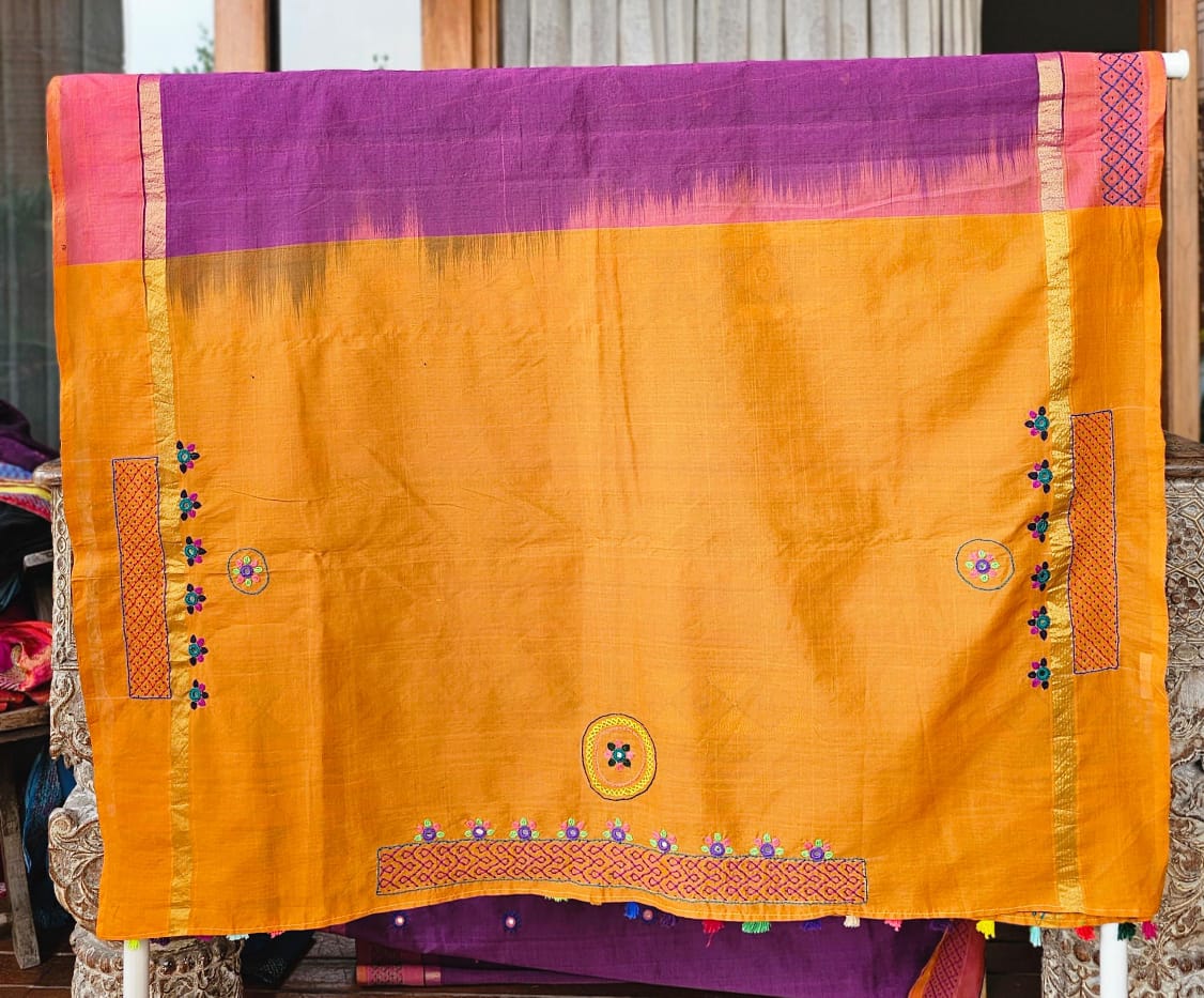 • Pure Ilkal handloom fabric • Traditional Lambani hand embroidery with mirror work • Vibrant thread detailing and artistic motifs • Elegant contrast border and designer pallu • Lightweight, breathable & comfortable for long wear