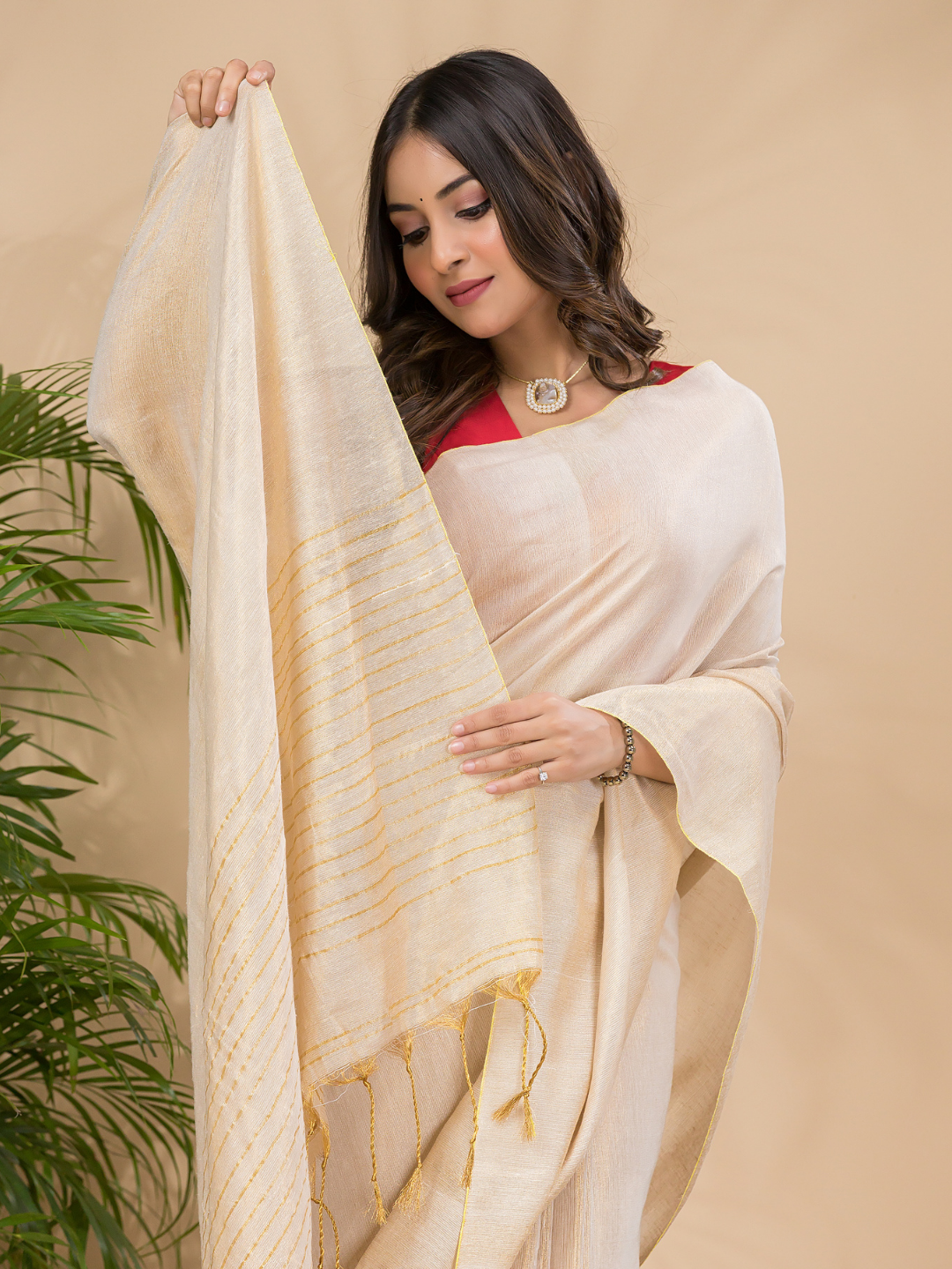 Experience effortless elegance with our Tissue Linen Handloom Saree. Woven by skilled artisans, this saree blends the softness of linen with the subtle shimmer of tissue for a graceful, lightweight drape. Perfect for festive occasions or casual gatherings, it offers comfort, style, and a touch of tradition.