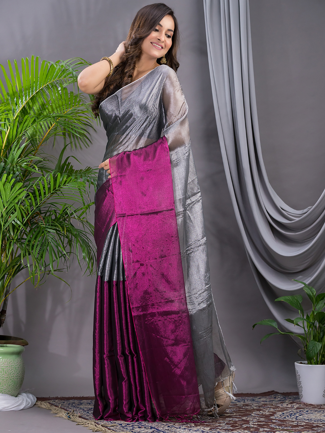 Unveil the timeless beauty encapsulated within the Tissue Silk Saree. Its delicate shimmer and feather-light texture render it a flawless option for grand occasions. Pair this saree with minimalist jewelry to accentuate its exquisite fusion of grace and luxury.